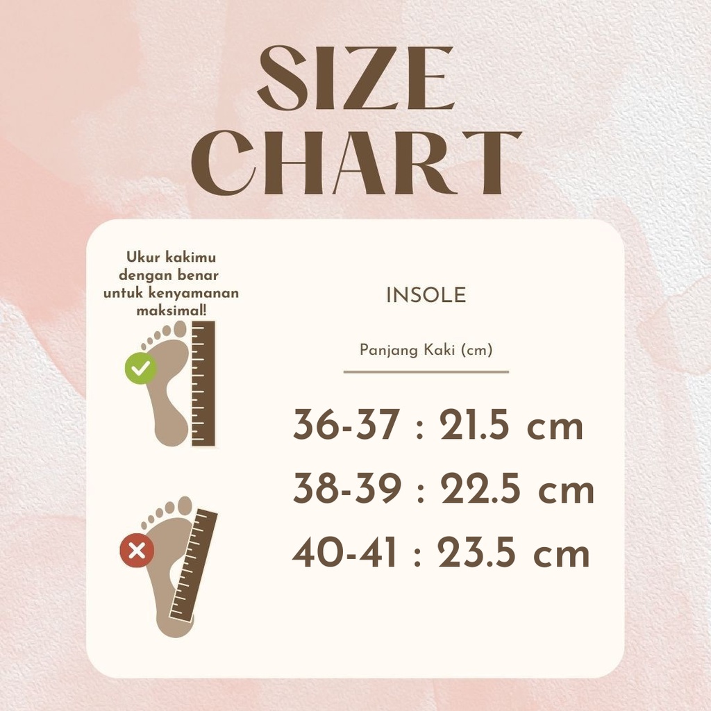 Disarankan naik 1 size untuk kaki yang lebar Insole : 36-37 : 21.5 cm 38-39 : 22.5 cm 40-41 : 23.5 cm