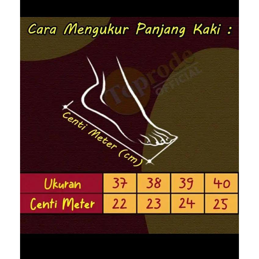 -Bahan SINTETIS --> Tidak kaku cenderung lentur sehinga nyaman dipakai. -Ready size 37-40 -insole Ukuran sendal : ( Diukur dari ujung tumit sampai ujung sandal ) 37 = 23,5 cm 38 = 24 cm 39 = 24,5 cm 40 = 25,5 cm
