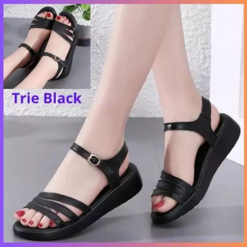 Sandal wedges wanita model terbaru tali belakang (TrieBlack)