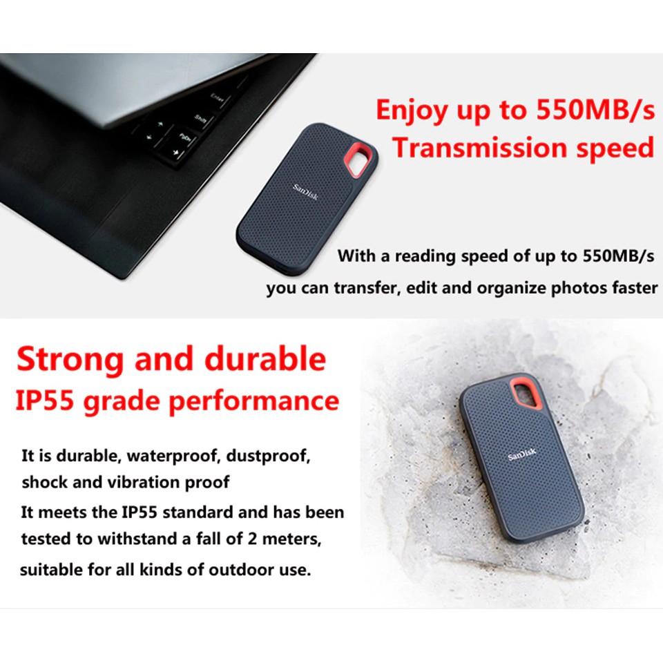 FEATURES Up to 550MB/s read speeds With high-performance transfers with up to 550MB/s read speeds**, the SanDisk Extreme® Portable SSD lets you offload files in a snap.