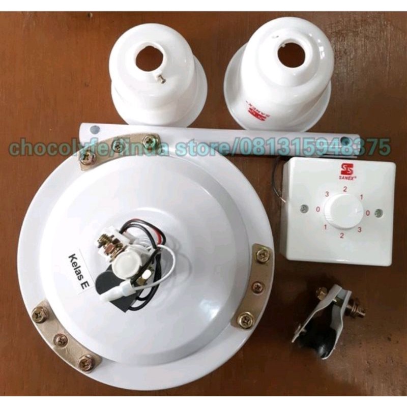 Warna : Putih gading Features : Voltage 220 v Daya : 90 Watt Kecepatan motor : 107-327 RPM Hembusan udara : 191 m3 / menit Kecepatan udara : 162 m / menit Diameter baling-baling : 56 [140 cm] Panjang pi Panjang Baling-baling 60Cm Berat : 5 kg Pengaturan : 5 kecepatan & off Motor dilengkapi dengan thermal fuse Suara motor & baling-baling halus (low noise) Baling-baling kokoh dan terbuat dari metal Dilengkapi dengan kawat baja sebagai pengaman Dilengkapi penutup sumbu motor tanpa kabel diluar Penyambung kabel langsung ke terminal Penutup sumbu untuk menghindari air yang masuk ke motor Pengait baling-baling pencegah baling-baling jatuh Menggunakan saklar pengaman dan tuas penekan pemutus arus listrik