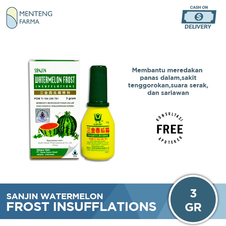 Sanjin Watermelon Frost Insufflations secara efektif dapat meredakan peradangan berulang dalam rongga mulut akibat panas dalam berlebih. Mengandung Mikroelemen, diantaranya Zink dan 18 jenis asam amino yang diperlukan bagi kesehatan tubuh. Produk ini dengan bahan utama Watermelon Frost dikombinasi dengan Herbal Fritillaria Cirroseae Bulbus kandungan yang terkenal, serta berharga, dan berkualitas tinggi, secara eksekutif di proses dengan teknologi tinggi.