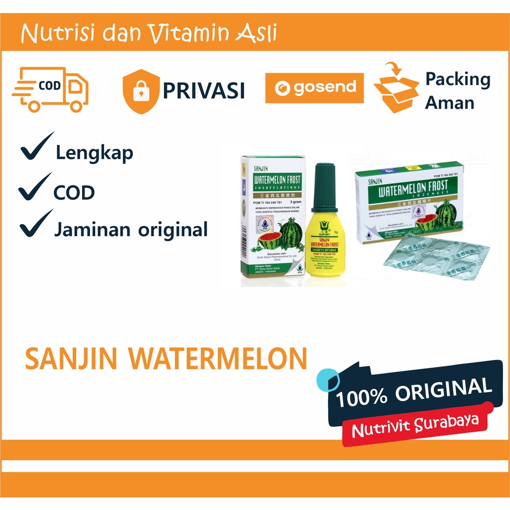 SANJIN WATERMELON FROST INSUFFLATIONS Sanjin Watermelon Frost Insufflations digunakan untuk membantu Mengobati radang tenggorokan , sariawan dan bibir pecah - pecah . Tenggorokan kering dan panas dalam. Komposisi : ( setiap 3 gram mengandung ) Citrullus Vulgaris..........................1.53g Fritillariae Cirrhosae Bulbus..........0.43g Momordicae Fructus....................0.18g Sophorae Tonkinensis Radix.........0.24g Belamcandae Rhizoma.................0.18g Scutellariae Radix.........................0.18g Menthollum..................................0.09g Indigo Naturalis............................0.15g