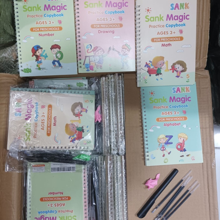 1 Paket Lengkap terdiri dari: - Buku belajar menulis Huruf - Buku belajar menulis Angka - Buku belajar menulis dan berhitung - Buku belajar menggambar - 1 Pen dengan 5 refill/isi ulang Magic Ink (1 terpasang + 4 cadangan)