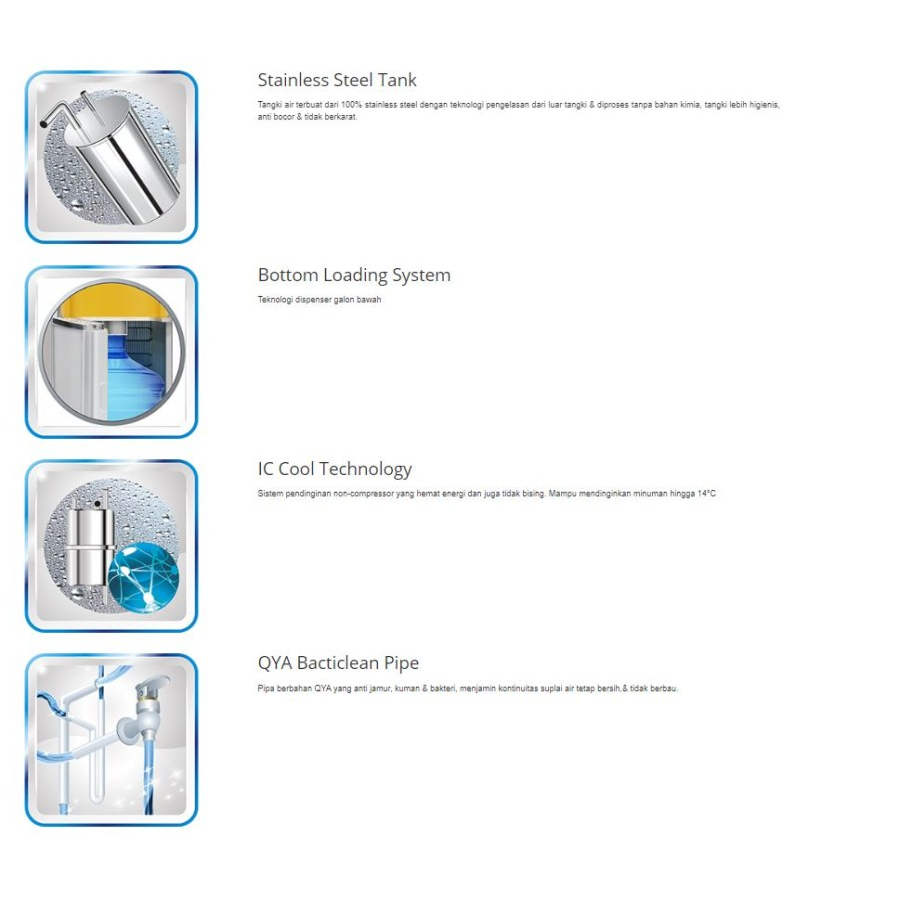 Fitur : Stainless Steel Tank QYA Bacticlean Pipe Z-Pipe Tecnology Night Light Super Hot Water Low Watt/ Fast Boil