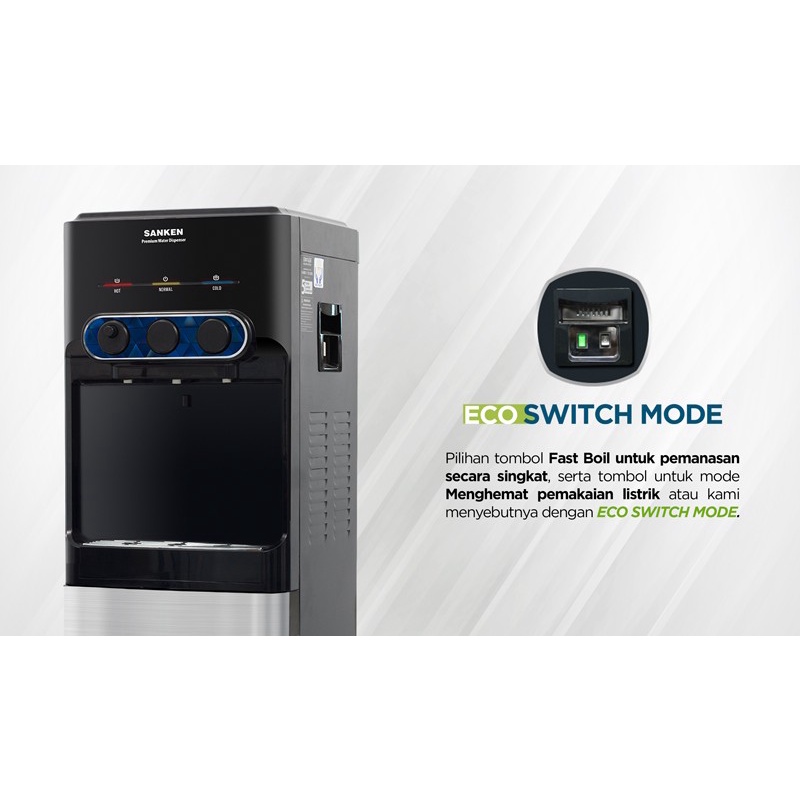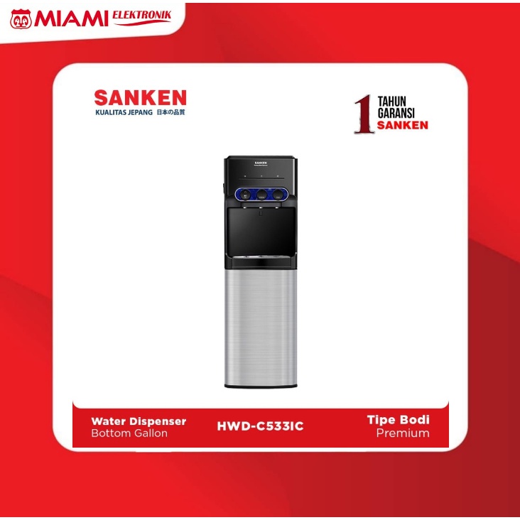 Sanken Water Dispenser HWD-C533IC dengan teknologi galon bawah. Dengan menggunakan tangki yang terbuat dari 100% stainless steel pada sistem pengelasan laser dari luar tangki sehingga menjadikannya lebih higienis, anti karat, anti rat cocok untuk kebutuhan keluarga Anda di rumah. Dilengkapi dengan IC Cool Technology sehingga proses pendinginan air minum menjadi lebih cepat dan dapat segera dinikmati. Sanken Water Dispenser HWD-C533IC lebih hemat listrik hingga 30% ditambah dengan pipa QYA yang anti jamur, kuman, dan bakteri sehingga menjamin suplai air minum tetap bersih, tidak berbau, aman diminum dan sehat.