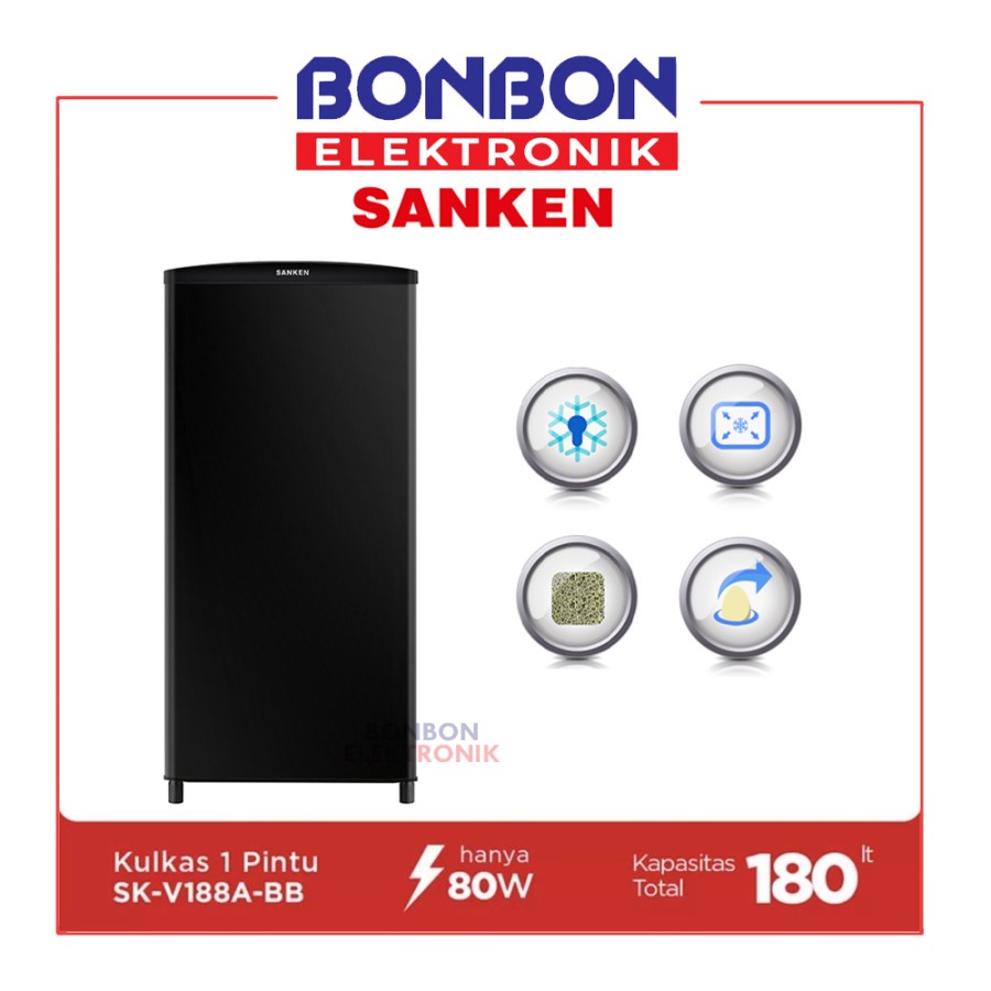 [Fitur Produk] SANKEN Kulkas 1 Pintu [155L] SK-V188A-BB merupakan kulkas yang sangat cocok untuk kebutuhan rumah tangga ataupun bisnis Anda. Dilengkapi dengan dinding HD yang tebal dan padat serta karet pintu yang berkualitas, sehingga menjadikan kulkas atau lemari es ini meraih skor rata-rata Running Ratio 36% artinya lemari es ini lebih cepat dingin, sehingga suhu dan kesegaran makanan menjadi lebih stabil dan terjaga. Selain itu, kulkas ini memiliki Cool Lock Freezer yang dapat menyimpan udara dingin hingga 13 jam pada saat listrik padam.