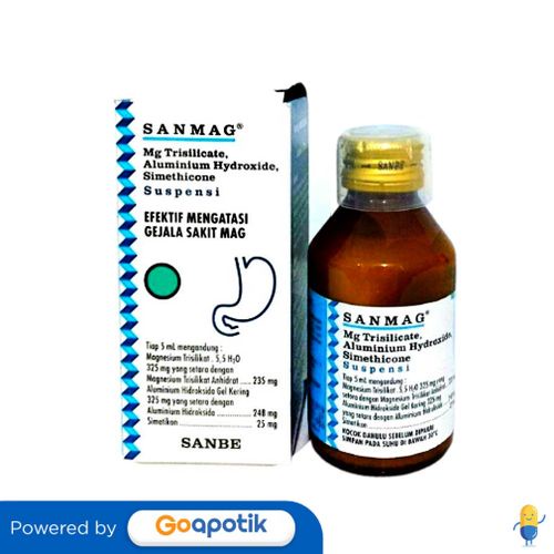 Deskripsi : Untuk terapi hiperasiditas, gastritis, spasme atau tukak lambung dan usus 12 jari, dispepsia neurogenik, hipermotilitas, flatulensi | Komposisi : Tiap 5 mL suspensi mengandung Magnesium trisilicate 325 mg, Al-hidroksida kolooidal 325 mg, simethicone 25 mg | Dosis : 1-2 sendok teh (5-10 mL), 3-4 kali sehari | Indikasi : Untuk terapi hiperasiditas, gastritis, spasme atau tukak lambung dan usus 12 jari, dispepsia neurogenik, hipermotilitas, flatulensi | Perhatian Khusus : Ketergantungan obat, amnesia & meningkatkan derajat epilepsi grand mal; penyakit otak organik, insufisiensi kardio-pulmonal, penurunan fungsi hati & ginjal, PPOK; hamil & laktasi; usia lanjut; hindari penggunaan jangka panjang > 2 minggu; hipofosfatemia & osteomalasia. | Kemasan : Botol 120 mL suspensi | NIE : DBL7822254033A1