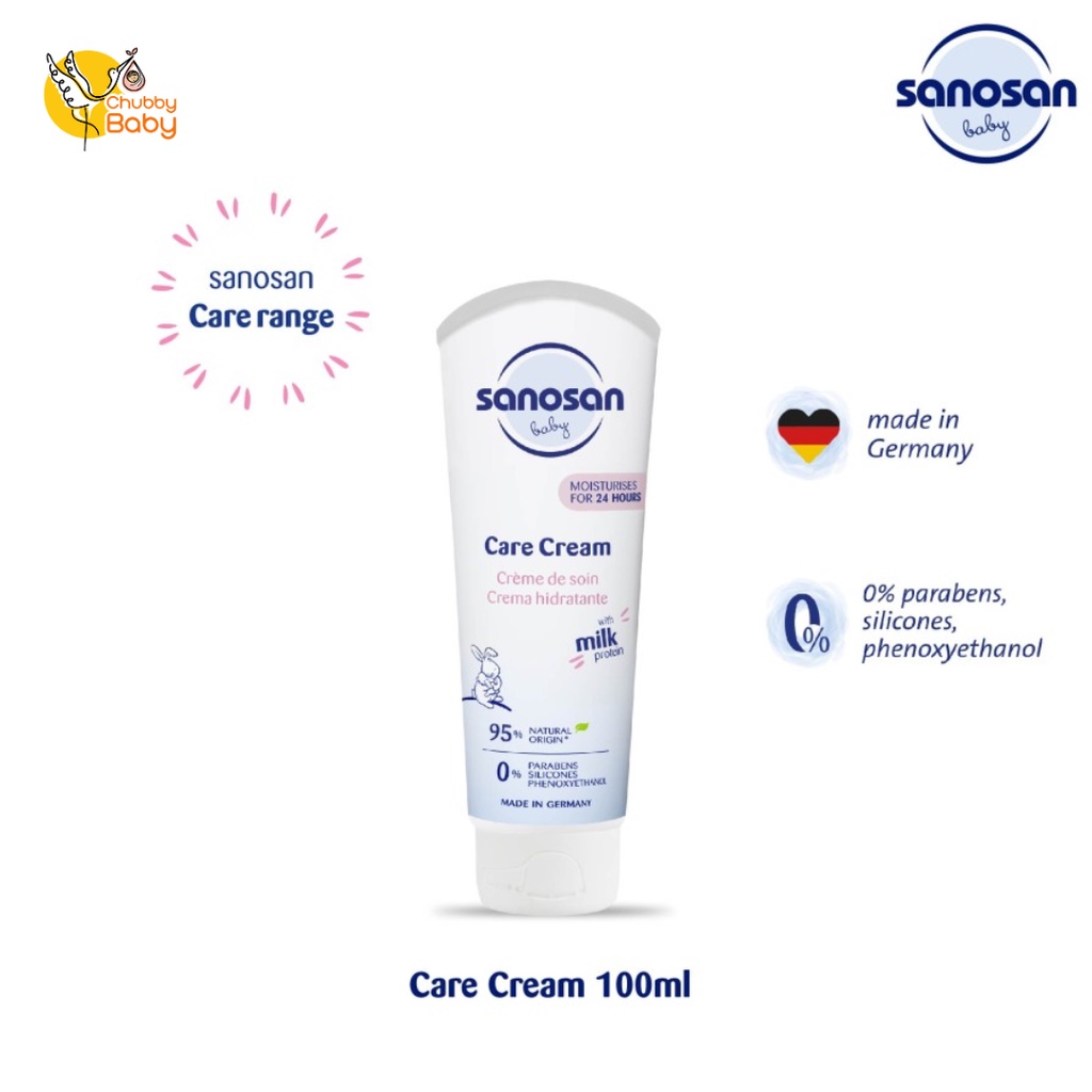 Sanosan Care Cream rangkaian Sanosan untuk menutrisi kulit wajah bayi dengan kandungan utama: • Protein Susu yang memberikan kelembaban alami untuk kulit dan rambut, bermanfaat untuk kulit kering dan sensitif. protein susu membentuk lapisan pelindung pada kulit untuk mempertahankan kelembaban secara alami. • Minyak Zaitun Organik berfungsi untuk menghaluskan dan melembutkan kulit • Allantoin sebagai komponen untuk menenangkan dan melindungi kulit, juga dapat membantu meringankan iriatasi kulit