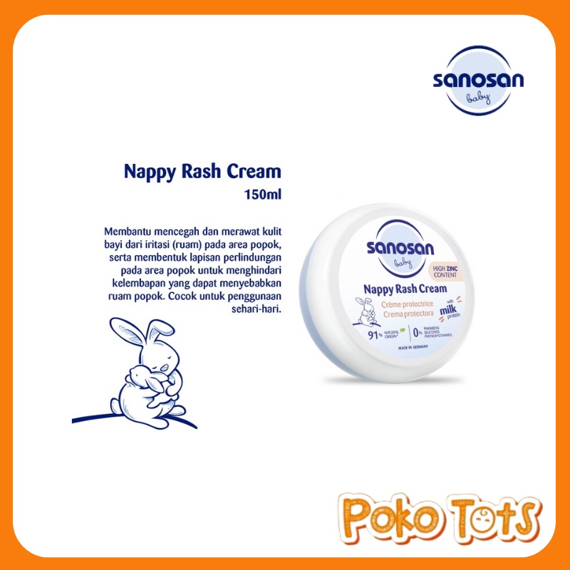 Sanosan Nappy Rash Cream membantu mencegah dan merawat kulit bayi dari iritasi (ruam) pada area popok, serta membentuk lapisan perlindungan pada area popok untuk menghindari kelembapan yang dapat menyebabkan ruam popok. Cocok untuk pengunaan sehari - hari dengan kandungan • Minyak Zaitun Organik yang dapat menghaluskan dan melembutkan kulit • Panthenol berfungsi untuk mempertahankan kelembaban dan meregenerasi sel; • Protein Susu yang memberikan kelembaban alami untuk kulit dan rambut, bermanfaat untuk kulit kering dan sensitif. protein susu membentuk lapisan pelindung pada kulit untuk mempertahankan kelembaban secara alami.