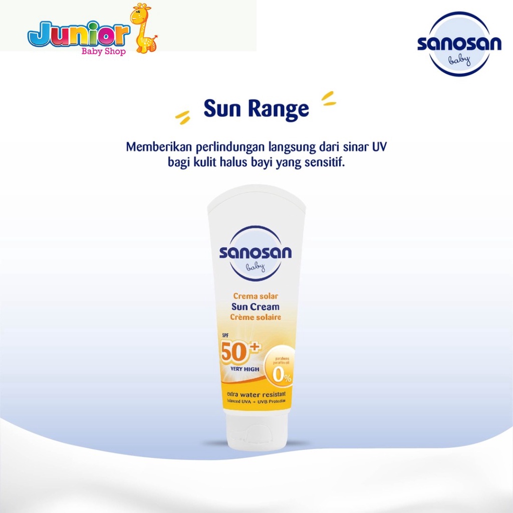 Sanosan Sun Cream melindungi kulit halus bayi dari sengatan matahari dengan SPF 50+ dapat melindungi kulit dari sinar UVA + UVB dan sudah water resistant