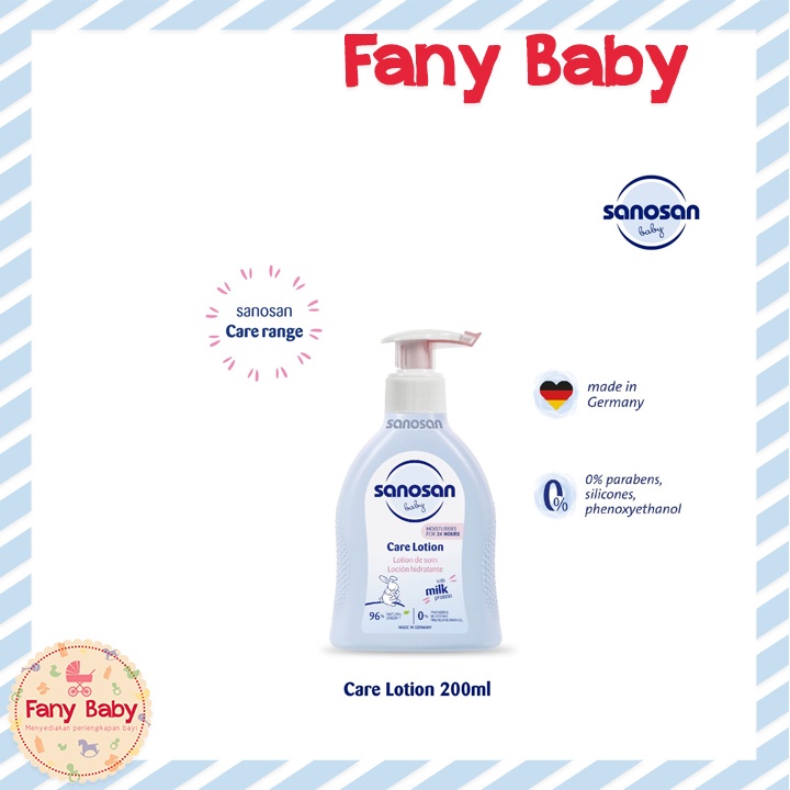 Sanosan Care Lotion 200ml. Sanosan Care Lotion melindungi dan menyeimbangkan kelembapan kulit dengan kandungan: ... protein susu membentuk lapisan pelindung pada kulit untuk mempertahankan kelembaban secara alami. Minyak Zaitun Organik dapat menghaluskan dan melembutkan kulit.