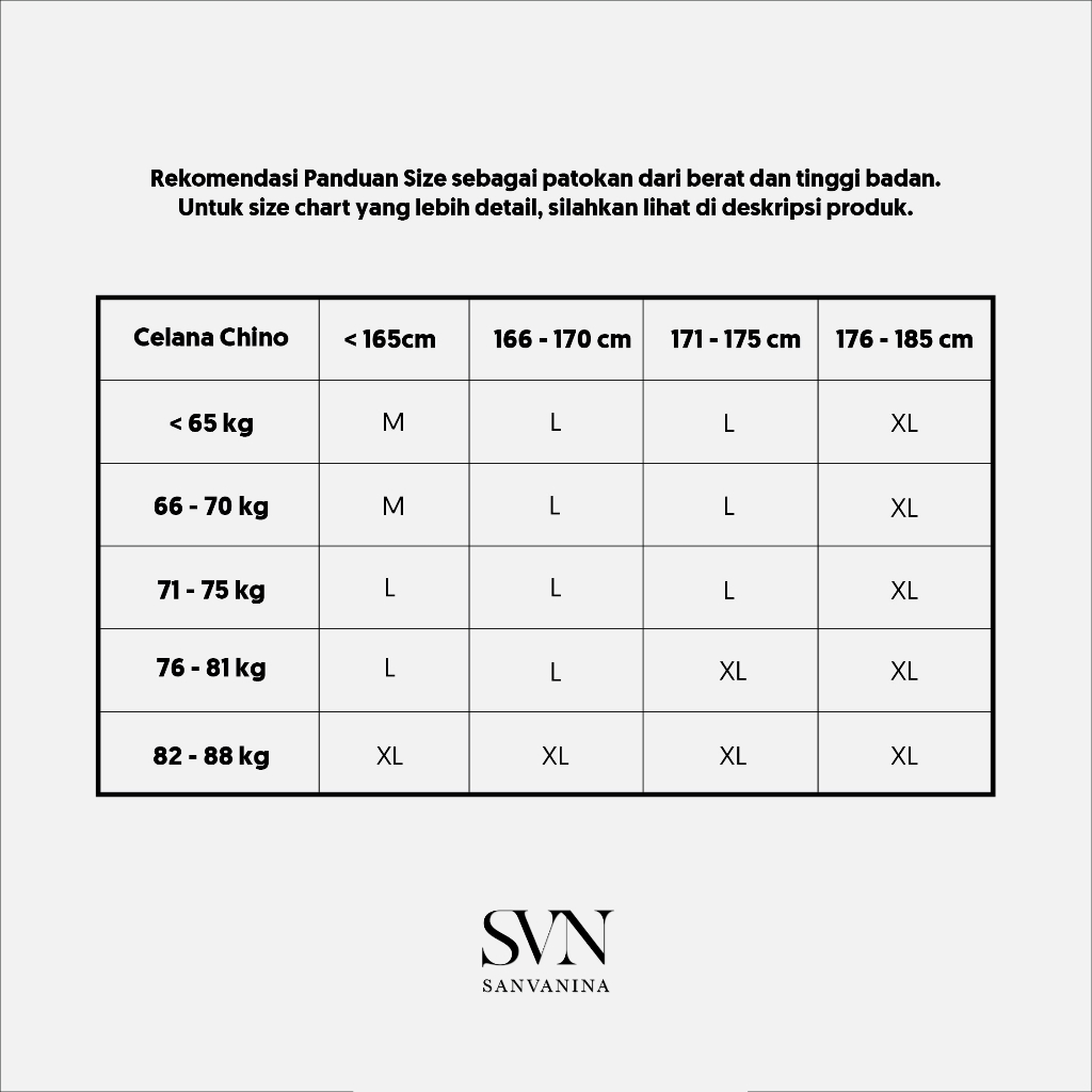 Size Chart: M (Setara Size 29-30) : Panjang Celana 95 cm - Lingkar Pinggang 78 cm L (Setara Size 31-32) : Panjang Celana 96 cm - Lingkar Pinggang 83 cm XL (Setara Size 33-34): Panjang Celana 98 cm - Lingkar Pinggang 89 cm *Toleransi ukuran ±2 cm.