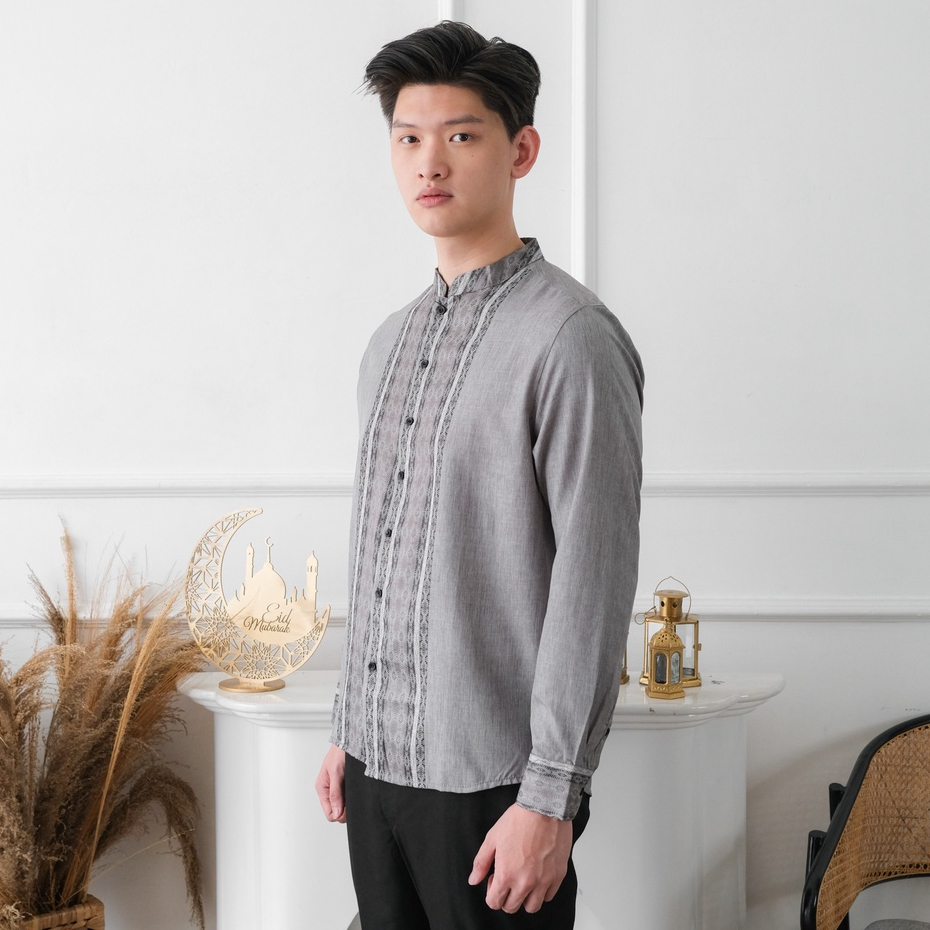 Detail SANVANINA Kemeja Koko Shanghai Pria Lengan Panjang Motif Songket Slim Fit | Baju Kurta Kerah Shanghai Hammad Grey EE-13A