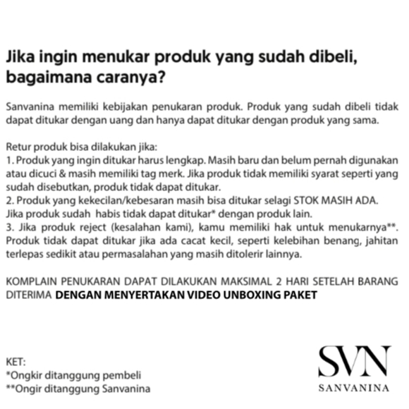 PENGIRIMAN: SENIN - MINGGU Jangan lupa AMBIL voucher Gratis Ongkir dan Voucher Toko. . Tertarik Untuk Menjadi Dropshipper kami Pengambilan Grosiran? Silahkan Hubungi kami ya, ada Harga Spesial. . Proud to wear local brand SANVANINA - The Right Place For Your Clothing!