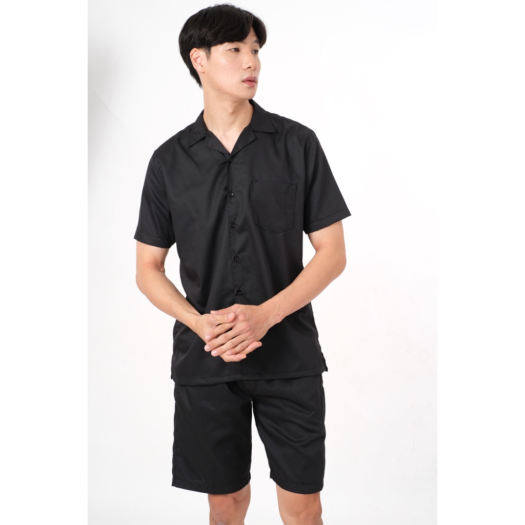 Pakaian Pria > Atasan > Kemeja > SANVANINA OneSet Kemeja Basic Polos | Kemeja One set | Pajamas Pria | Oneset Pantai Polos | Hawaian Set | Bowling Set Black | EB-10G