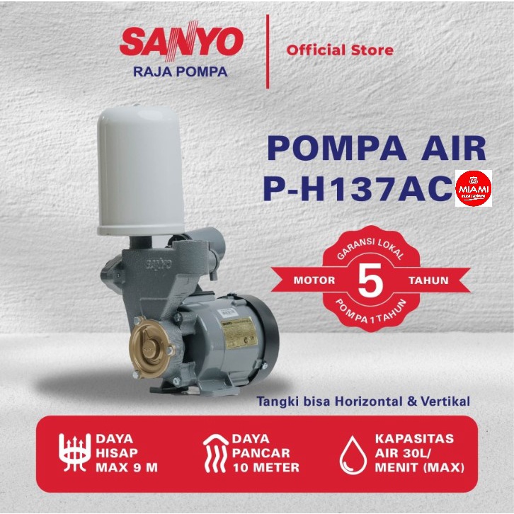 Pompa Air Sanyo Memilki Kualitas yang sudah teruji daya tahan dalam pemakaian rumahan. Banyak digunakan untuk sumur dangkal maupun sebagai pendorong air pam. Pompa SANYO memilki daya listrik yang Hemat dan tentunya memiliki Garansi Resmi jika adanya kerusakan.