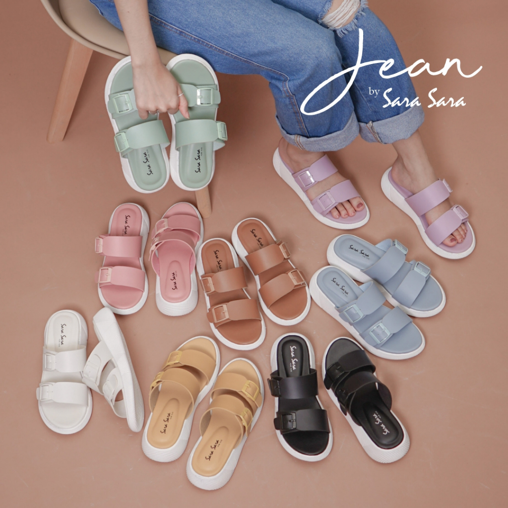 Detail Sara Sara JEAN Sendal Slop Wanita Kekinian Selop Wanita Hak Flatform Gesper Sol Karet Terbaru