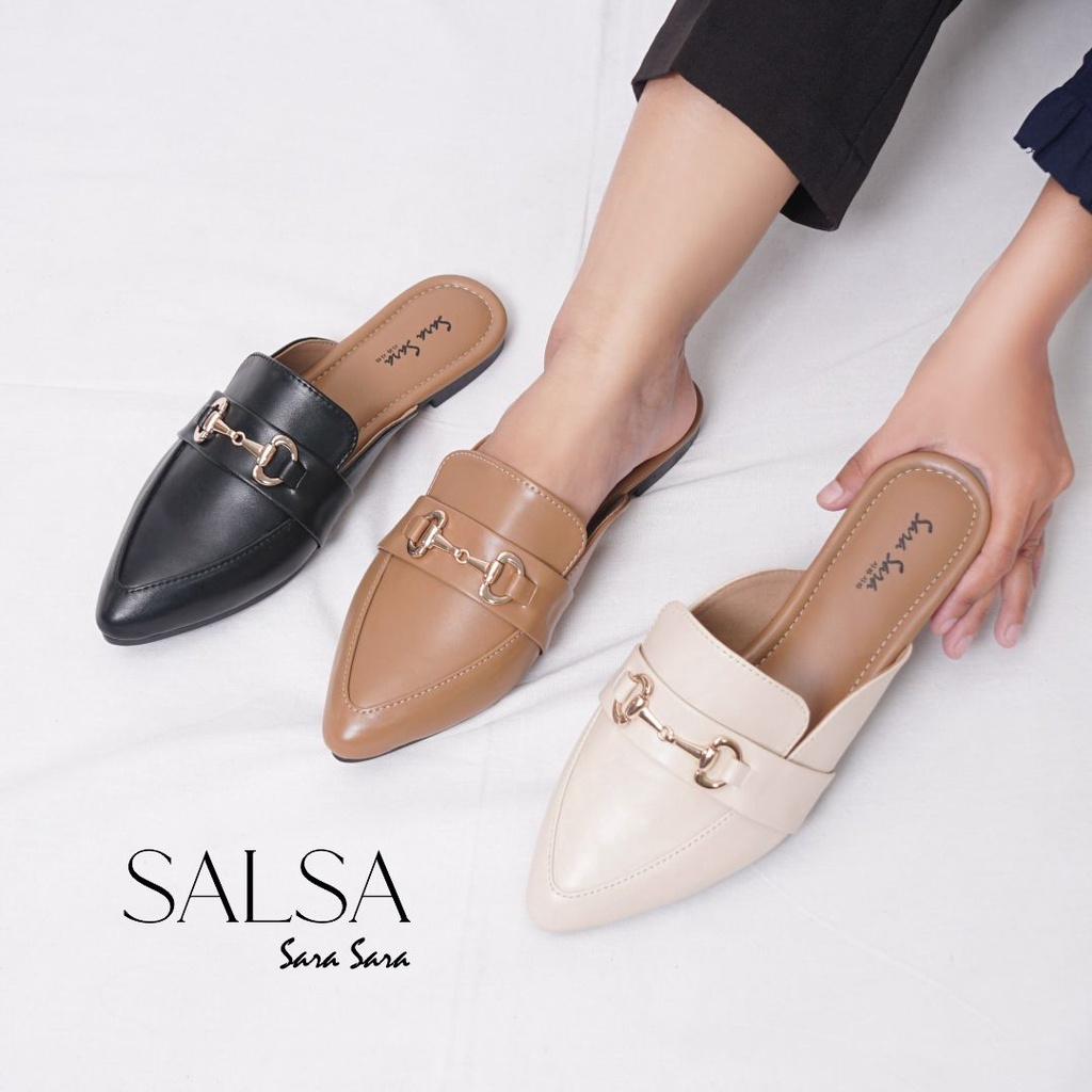 Detail Sara Sara SALSA Sandal Slop Wanita Sendal Mules Cewek Selop Kasual Slide Hak Rendah Variasi Gesper Kekinian