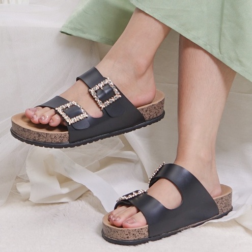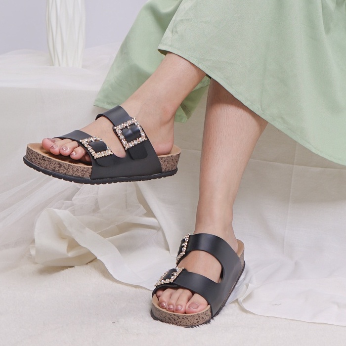 SARASARA YUK - KIMMY Sandal Wanita Slop Casual Size 36 - 41 Model Birken Sol Puyuh Sara Sara Sendal Cewek Kulit Santai Rumahan Strap Gesper dua Kristal Blink Empuk 37 38 39 40 Warna White Hitam Soft Selop Anti Slip Original Shoes ORI Mall Official Store