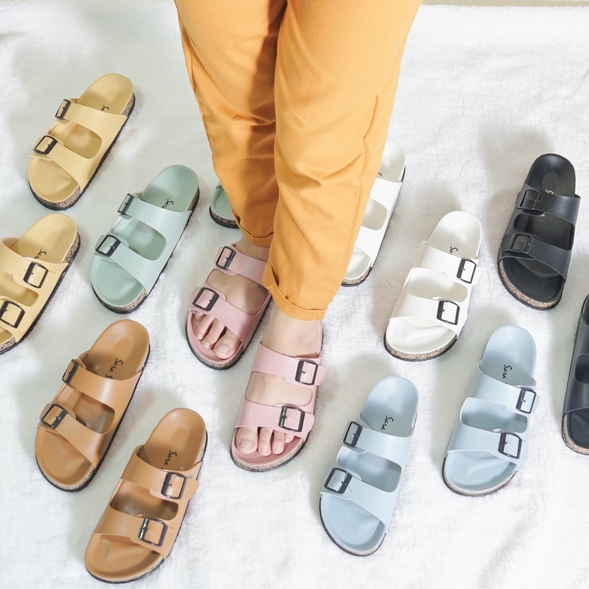 SARASARA YUK - Sandal Wanita Slop Casual Model Birken Sol Puyuh SARA SARA JINNY Sendal Selop Cewek Kulit Santai Strap Gesper Ban dua Empuk Size 36 37 38 39 40 Warna Blue Biru Soft Anti Slip Premium Original Kekinian Terbaru Shoes ORI Mall Official Store