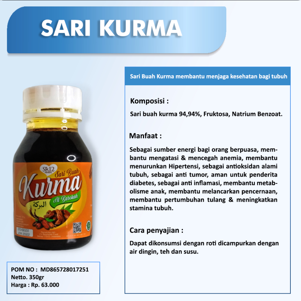 Pure Kurma Arab pilihan dengan kualitas premium Saran penyajian : Campurkan sari kurma SR12 dengan susu Gomilku, Cocok sekali untuk stamina selama bulan ramadhan. BPOM MD865728017251