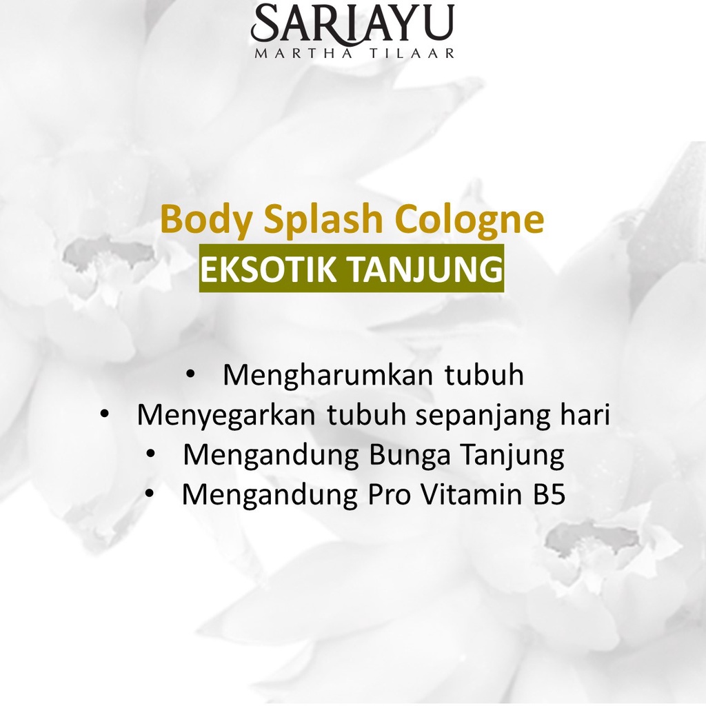 Sariayu Tanjung Body Cologne 150 ml Nikmati keharuman eksotika Tanjung yang membuat tubuh segar serta harum alami mempesona. Body Mist yang dapat menyegarkan tubuh sepanjang hari dengan keharuman bunga tanjung yang eksotis dan diperkaya pro Vit B5. Rasakan Manfaat Tanjung pada Rangkaian Sariayu Tanjung Bunga tanjung yang harum menghasilkan minyak atsiri yang dapat digunakan sebagai parfum, begitu juga dengan kulit batangnya. Studi beberapa tahun terakhir juga mengungkapkan bahwa tanjung memiliki aktivitas antibakteri, antioksidan, dan pencerah kulit sehingga berpotensi untuk dimanfaatkan sebagai bahan baku kosmetik. Cara penggunaan: Tuangkan ke telapak tangan lalu ratakan ke bagian tubuh yang diinginkan.