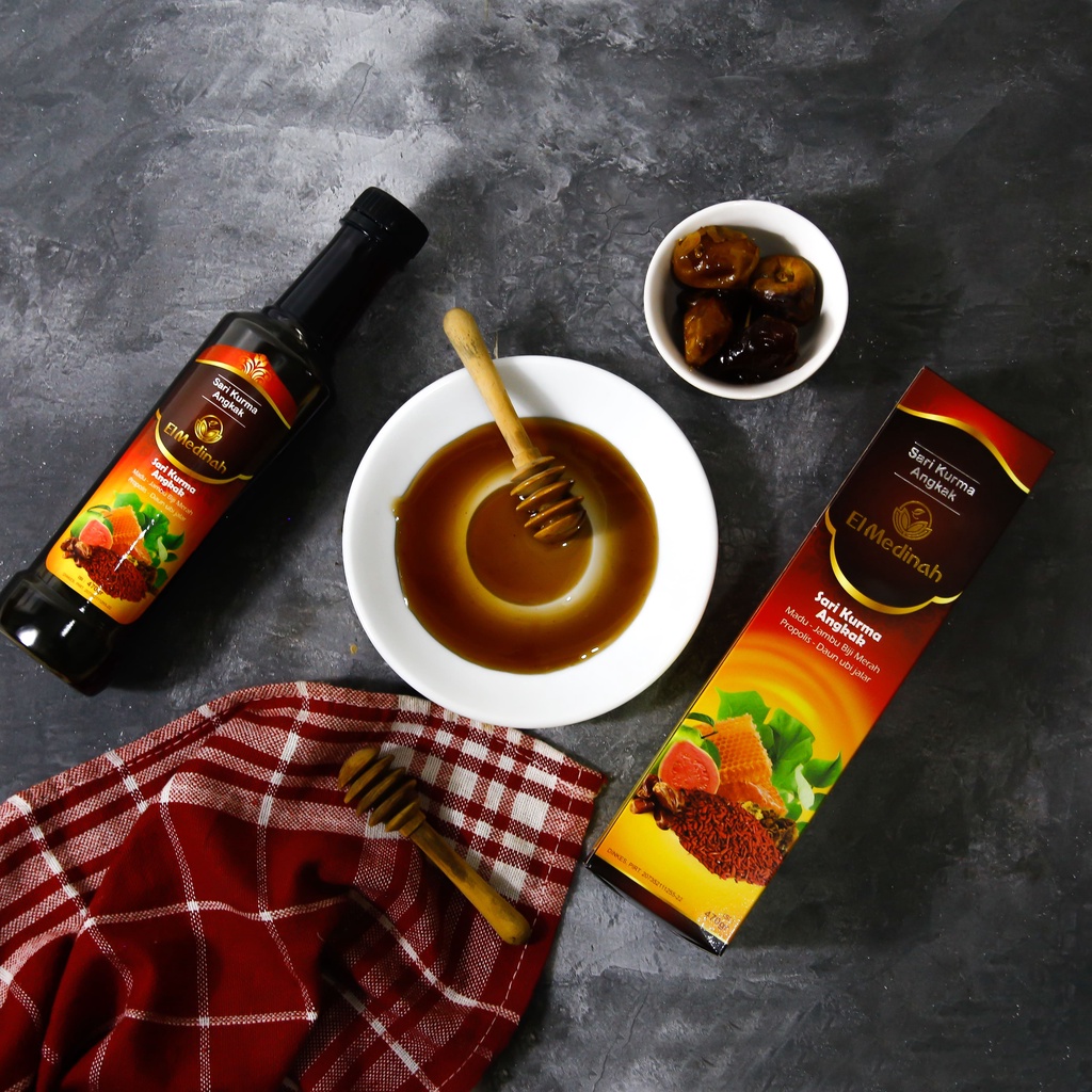 Sari Kurma Madu Angkak plus Daun Ubi Jalar El Medinah adalah sarikurma yang di formulasikan dari berbagai macam herbal pilihan, yang di ramu oleh tenaga profesional dan berpengalaman yang terdiri dari madu, Sari Kurma, Angkak, Propolis, Jambu Biji Merah, dan Ubi Jalar serta herbal pilihan lainnya.