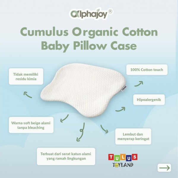 Alphajoy® CUMULUS Organic Cotton Baby Pillow Case terbuat dari serat katun alami yang ramah lingkungan. Sarung bantal organic cotton Alphajoy® berwarna soft beige alami tanpa proses pemutihan. Tidak mengandung bahan kimia berbahaya yang dapat membahayakan kesehatan dan alam. Dalam kehidupan sehari-hari, kita selalu berhadapan dengan bahan kimia, sedangkan katun alami tidak memiliki residu kimia berbahaya selama produksi dan pengolahan, meminimalisasi alergi, asma atau dermatitis heterotopik.