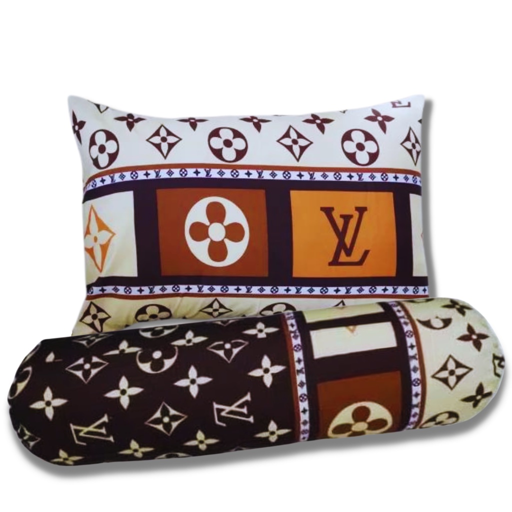 Detail sarung bantal dan guling 1set murah motif LV Coklat bahan katun disperse warna tidak luntur