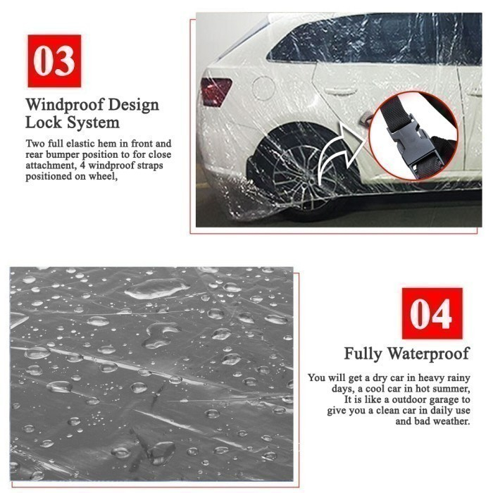 Preview singkat: - Terbuat dari bahan plastik transparan tebal BUKAN BAHAN SEKALI PAKAI - Dijahit dengan teknik double stitch - Terdapat kancing klip pengunci 4 titik untuk tiap roda, dan sudah full karet - Cocok untuk pemakaian full indoor & outdoor. Aman untuk kondisi hujan, waterproof - Tidak meninggalkan residu / bercak pada body atau cat mobil anda - Pola disesuaikan agar cocok untuk mobil-mobil yang dipasarkan di Indonesia