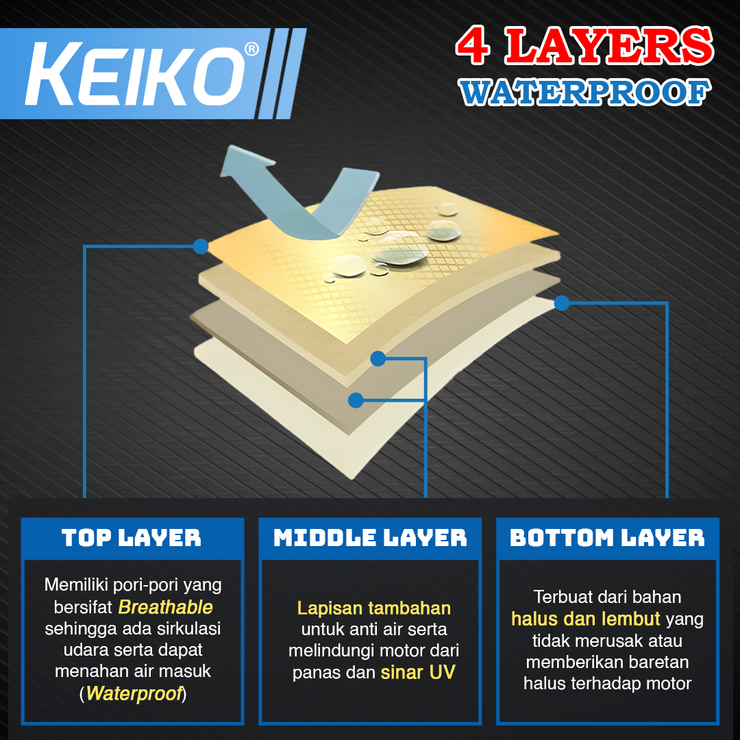 Keunggulan dari Keiko Ultimate (Extreme): - Memiliki 4 lapisan premium untuk perlindungan terhadap kondisi extreme - Lapisan tersebut berfungsi sebagai lapisan FULL WATERPROOF 99%, UV protection, debu, baret, dll - Bahan tebal sehingga kuat, tahan lama, dan terjamin. - Breathable layers (sirkulasi udara lancar walaupun tebal) - Fit sesuai ukuran motor - Full karet dan ada tali pengikat untuk menahan angin kuat - Free tas penyimpanan