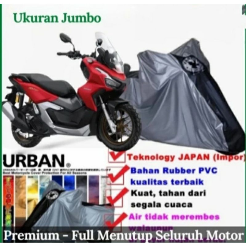 Keunggulannya : - Original Urban Premium Ukuran Jumbo - Ukuran Full masuk menutupi motor ADV PCX 150 160 Aerox Nmax dll - Waterproof 100% Kualitas bagus :D - Anti air bisa untuk outdoor bahan PVC - Teknology JAPAN (Impor) - Bahan Rubber PVC kualitas terbaik, kuat, tahan dari segala cuaca, Anti UV Sinar Matahari. - Tidak Mudah Robek. Terdiri dari 1 lapis dan terbuat dari bahan yang tebal, air tidak merembes walaupun di guyur hujan deras. - Tahan air hujan dan panas matahari. - Warna silver kombinasi hitam