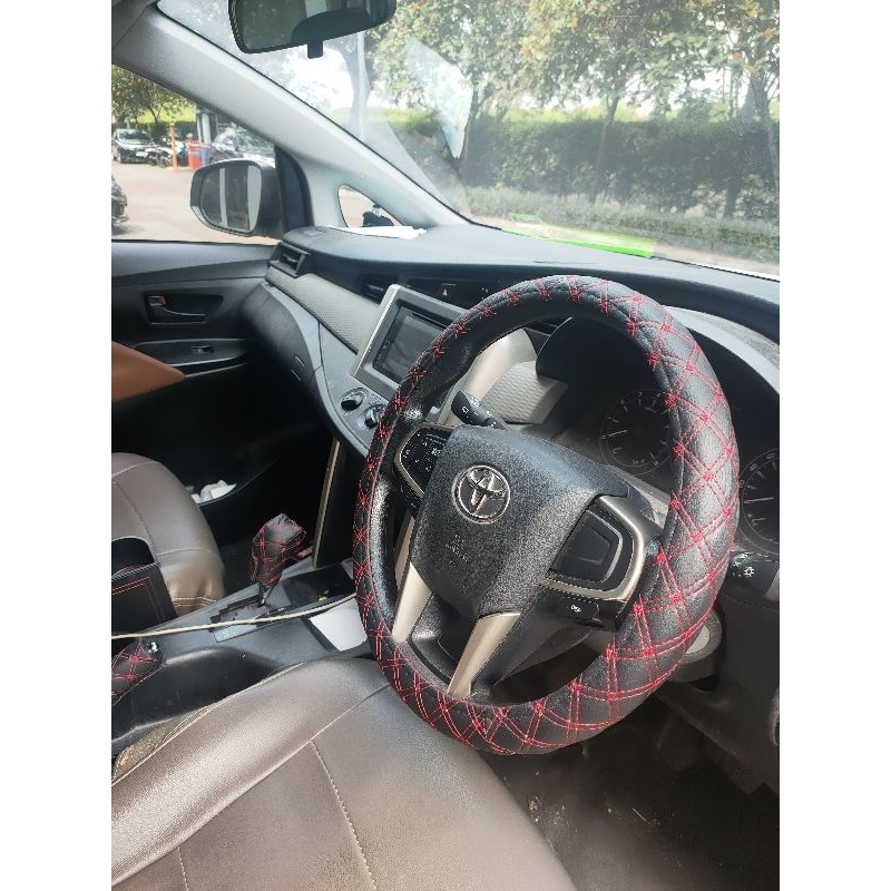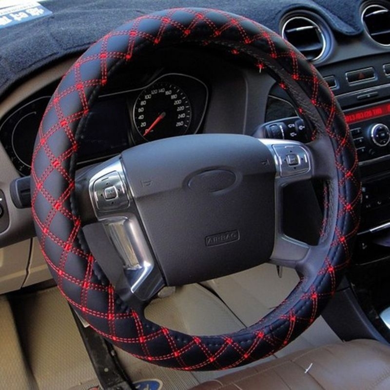 Sarung Stir Mobil jahitan Merah dan Jahitan Putih. Cover setir mobil ini terbuat dari bahan kulit sintetis yang lembut dan nyaman di tangan, tidak licin dan mampu mencegah tangan Anda slip saat memegang setir. Setir ini memiliki diameter sekitar 38 cm, sehingga cover ini dapat digunakan pada setir dengan ukuran yang sesuai