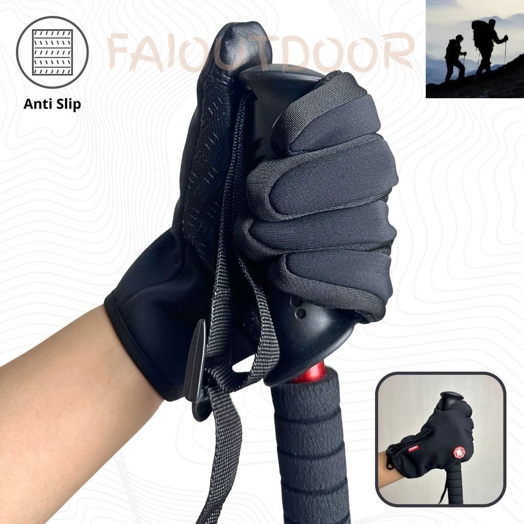 Sarung tangan dengan bahan polar hangat di bagian dalam dan anti air di bagian luar yang cocok untuk digunakan saat berkendara, ataupun kegiatan hiking. Dilengkapi dengan lapisan khusus di bagian jari untuk bisa menyentuh layar smartphone.