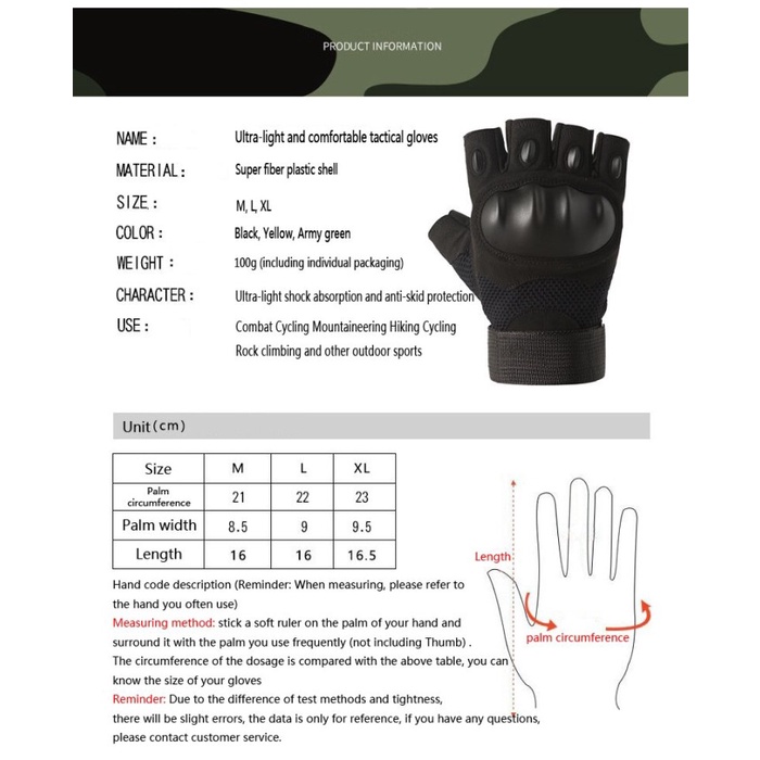 Bagian belakang sarung tangan terbuat dari bahan yang kuat. Dapat dengan baik melindungi persendian tangan - Telapak tangan sarung tangan adalah bantalan EVA setebal 3mm. - Tali pengatur di pergelangan tangan memudahkan untuk menyesuaikan sarung tangan - Ditambah desain tali pengikat, nyaman dan praktis - Bahan adem dan nyaman. - Cocok untuk olahraga luar ruangan seperti mendaki gunung, berkemah, berburu, memancing, bermain ski, menembak