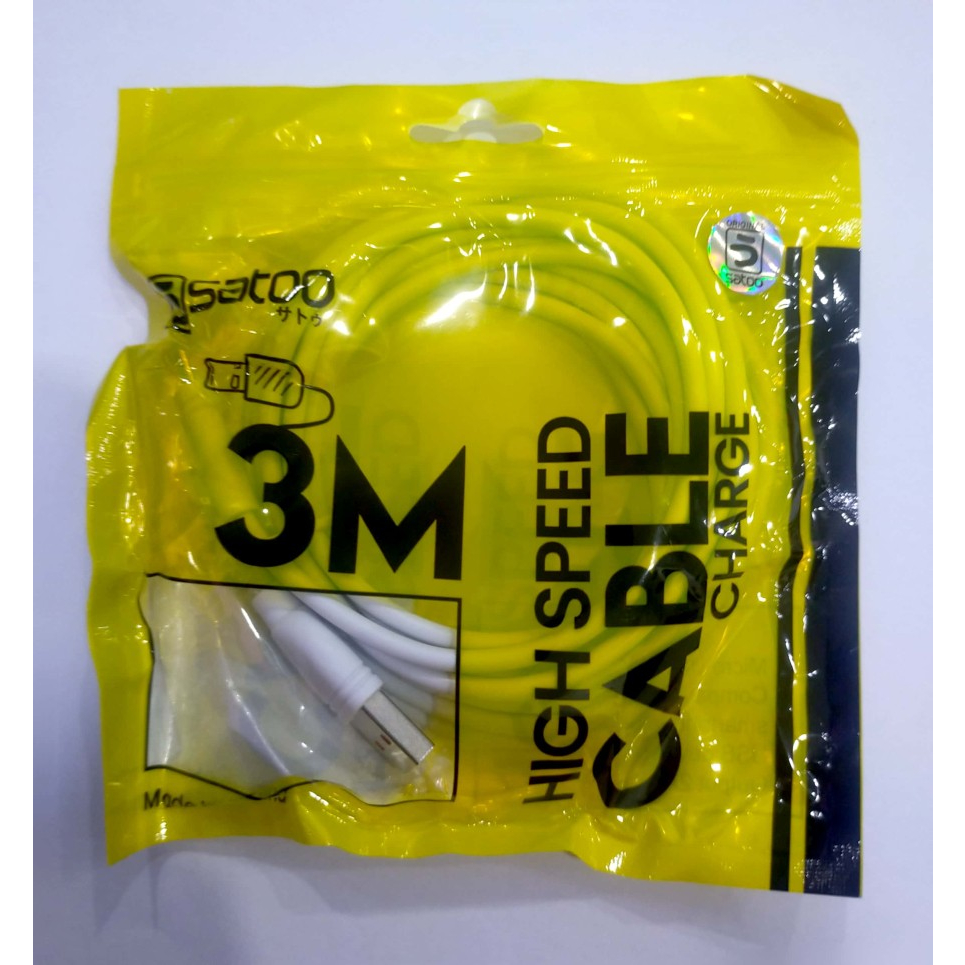 Kabel Data Mikro USB Satoo panjang 3 meter dengan kecepatan tinggi dan dengan bahan yang berkwalitas baik sehingga fisik kabelnya juga tahan lama. Dapat di gunakan untuk charge. Kabel ini dapat digunakan untuk charge melalui powerbank, PC, Laptop maupun dari adaptor listrik. Dengan konektor yaitu micro usb dan USB 2.0 tentu saja support untuk segala macam smartphone yang ada di pasaran.