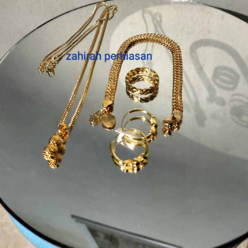 Detail satu set perhiasan wanita motif emas kalung Milano liontin kacang+tikar titanium 888