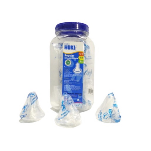 Dot Huki dilengkapi dengan lubang udara di bagian samping dot yang berfungsi mencegah dot mengempis mendadak dan menjaga kelancaran aliran air susu. Hal ini mencegah bayi tersedak dan kembung. Dot Silicon Regular Baby HUKI selembut payudara ibu. Dot terbuat dari liquid-silicone sehingga lebih elastis