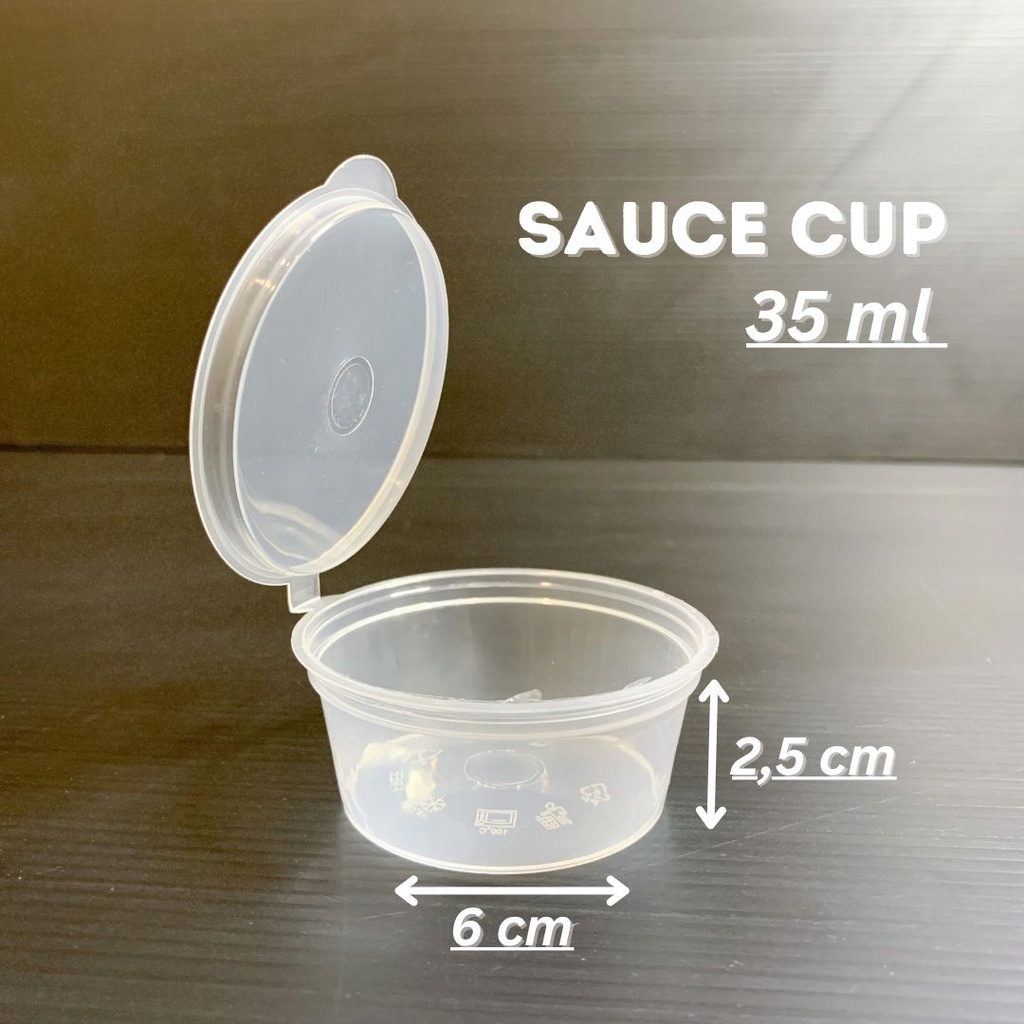 Sauce Cup 35 ml ( tutup sambung ) Diameter bawah : 4,3 cm Diameter atas : 5,7 cm Tinggi : 2,5 cm Tebal : 0,45 mm Warna : transparan 1 pack isi 50 pcs