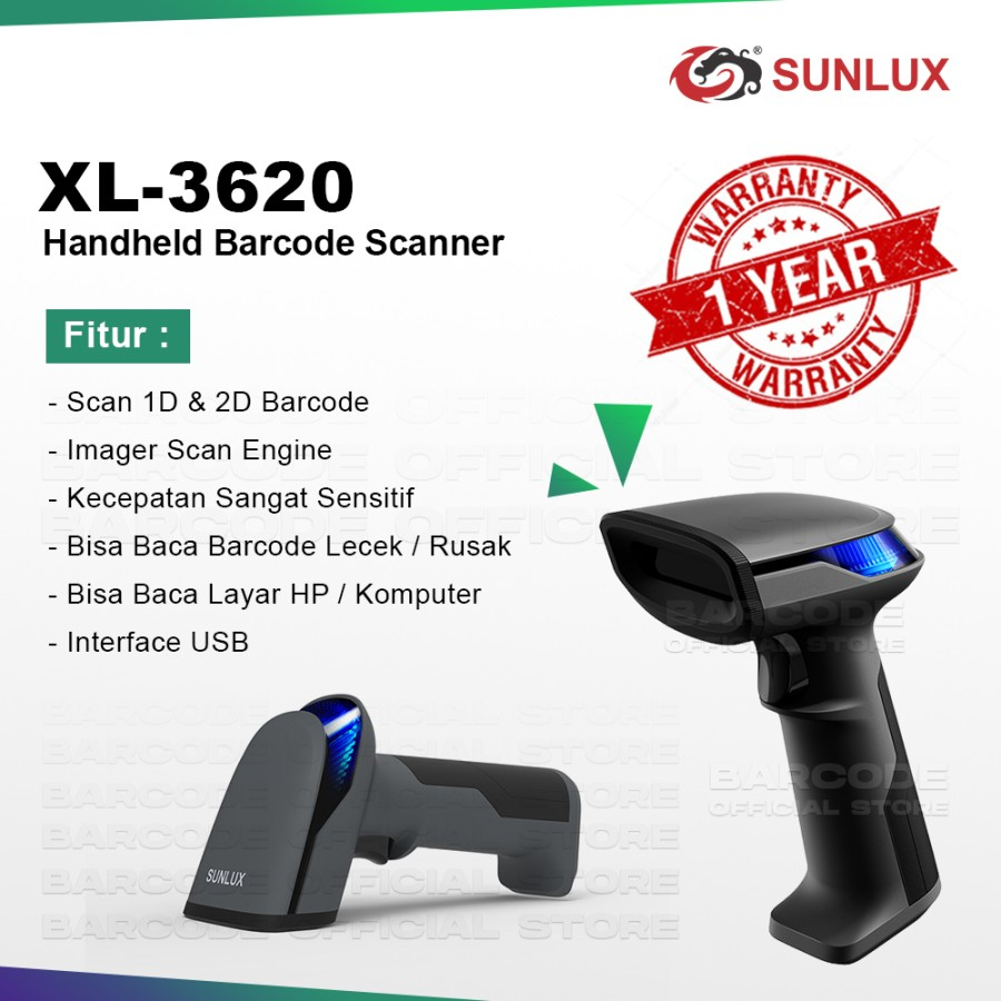 Barcode Scanner SUNLUX XL-3620 merupakan barcode scanner 2 Dimensi (2D) yang mana sangat cocok digunakan pada sektor kebutuhan mini market. Selain dapat membaca barcode pada permukaan kertas, barcode scanner Sunlux XL3620 2D ini dapat membaca barcode pada layar Handphone, Tablet maupun Layar Monitor.