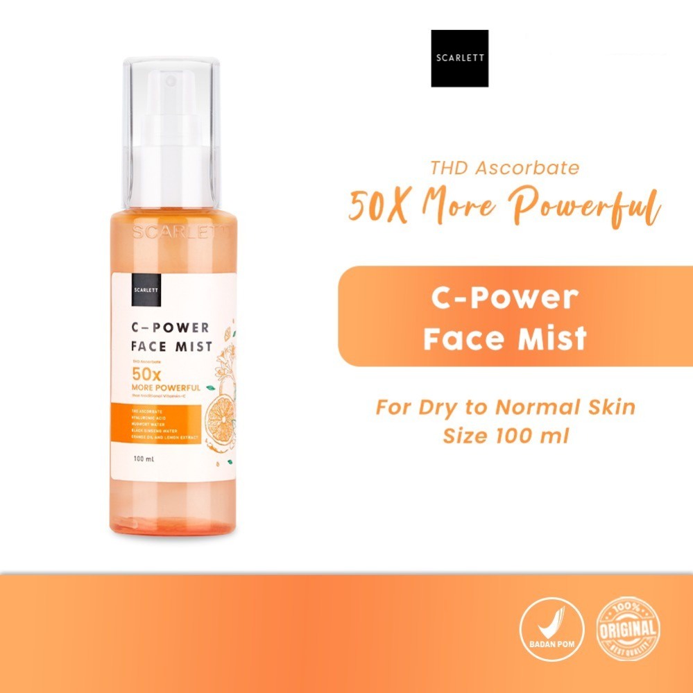Scarlett Whitening C-Power Face Mist Kandungan : 1.) THD (Tetrahexyldecyl Ascorbate) - Vitamin C 50x lebih kuat dari asam askorbat standar - Membantu melindungi kulit dari efek buruk paparan sinar UV - Membantu mencerahkan kulit - Membantu menyamarkan tampilan kerutan dan garis halus - Membantu menjaga kelembapan kulit
