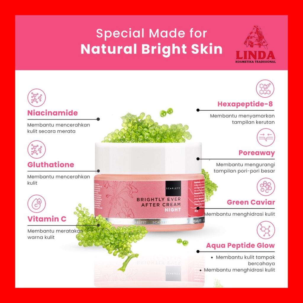 Glutathione, Niacinamide, Natural Vit-C, Hexapeptide-8, Poreaway, Green Caviar dan Aqua Peptide Glow yang dimana bermanfaat sebagai :