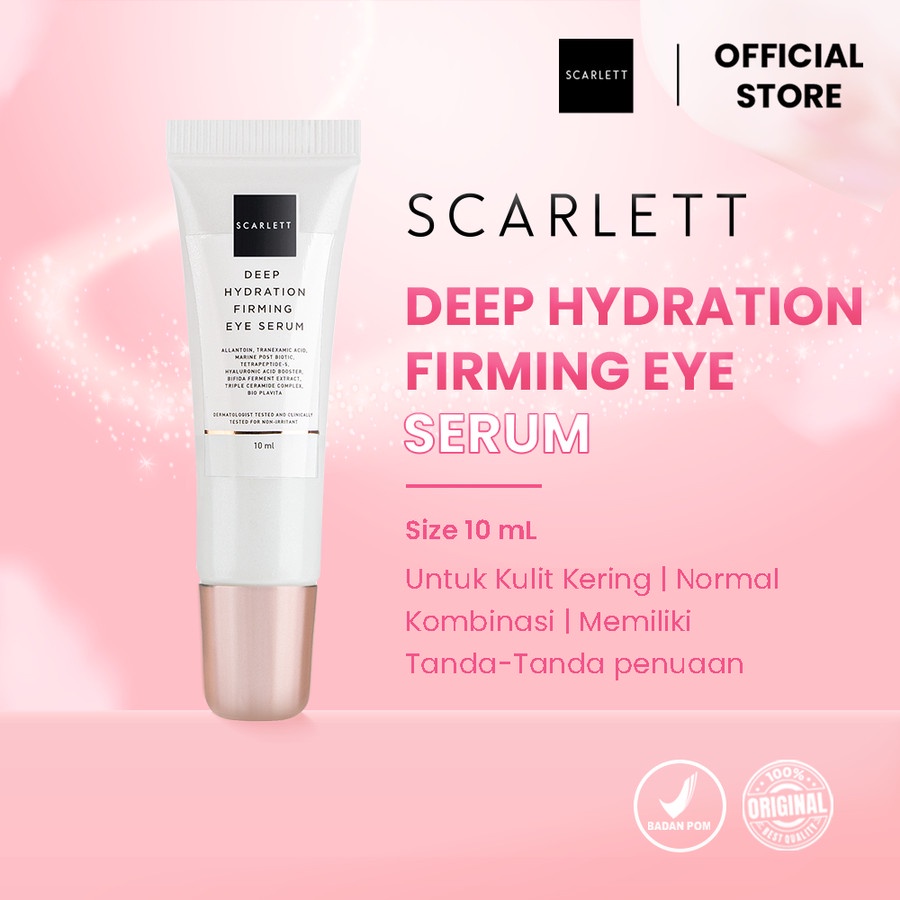 ⭐ Scarlett Whitening Age Delay - Deep Hydration Firming Eye Serum 10Ml ⭐ Kandungan: ⭐ Marine Post Biotic ⭐ • Membantu menyamarkan garis-garis halus dan kerutan pada area mata • Membantu merawat elastisitas kulit area mata