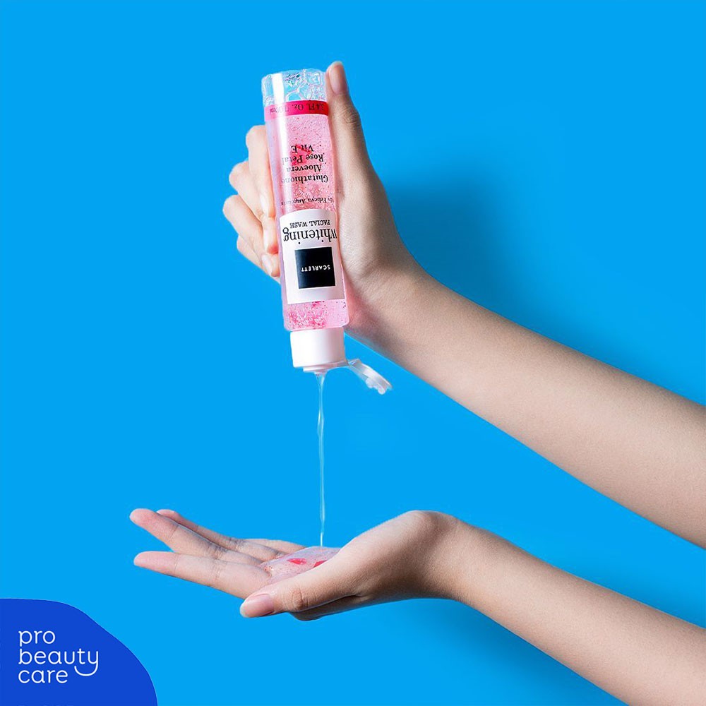 Apa yang dapat dilakukan dengan facial wash Scarlett? Di dalam Scarlett Whitening Facial Wash terdapat kandungan Glutathione, Vitamin E, Rose Petals dan Aloe Vera untuk : 1. Membantu mencerahkan wajah. 2. Membantu menutrisi serta mengecilkan pori-pori di wajah. 3. Membantu mengontrol kadar minyak berlebih di wajah. 4. Membantu menghilangkan beruntus/jerawat di wajah. 4. Membantu meregenerasi kulit wajah agar tampak lebih fresh