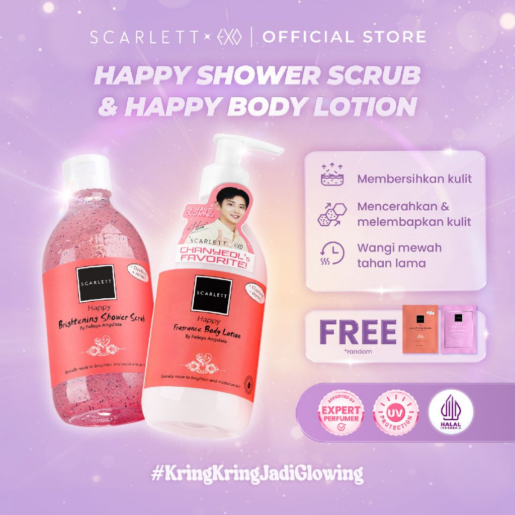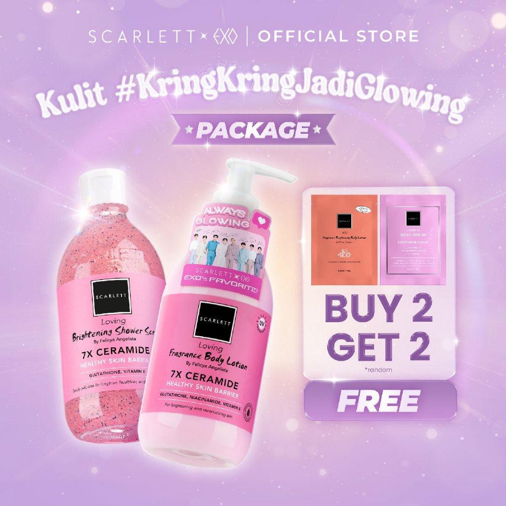 Detail Scarlett Whitening #KringKringJadiGlowing Package (shower scrub & body lotion get 2 sachet bodycare) Scarlett Whitening Bundling Body Lotion EXO dan Shower Scrub terdiri dari :