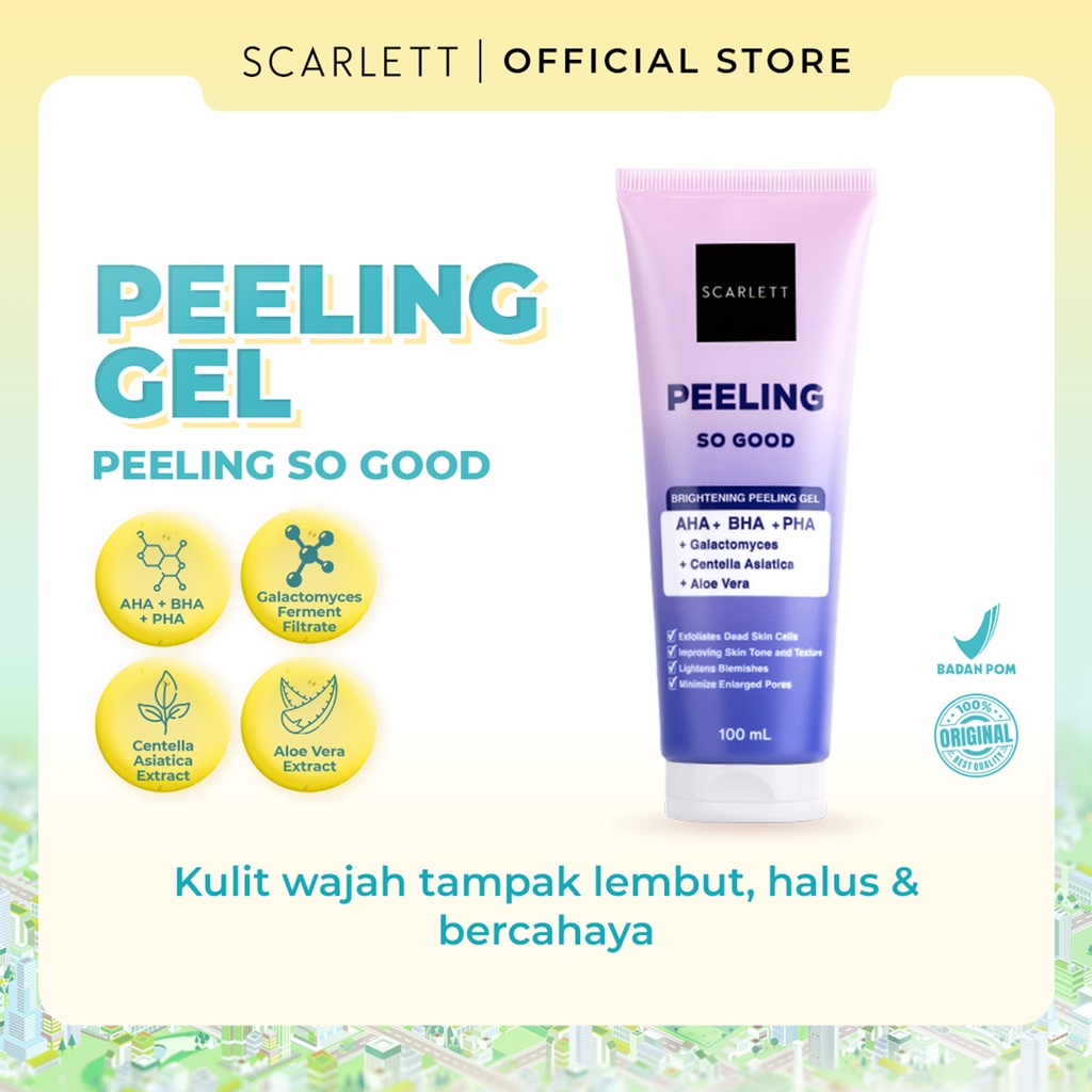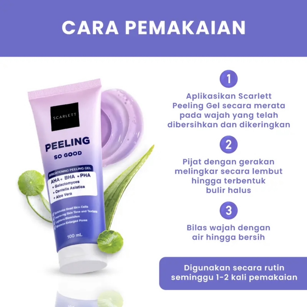 Cara Pakai: • Aplikasikan Scarlett Peeling Gel secara merata pada wajah yang telah dibershkan dan dikeringkan • Pijat dengan gerakan melingkar secara lembut hingga terbentuk bulir halus • Bilas dengan air bersih • Gunakan 1-2 kali dalam seminggu