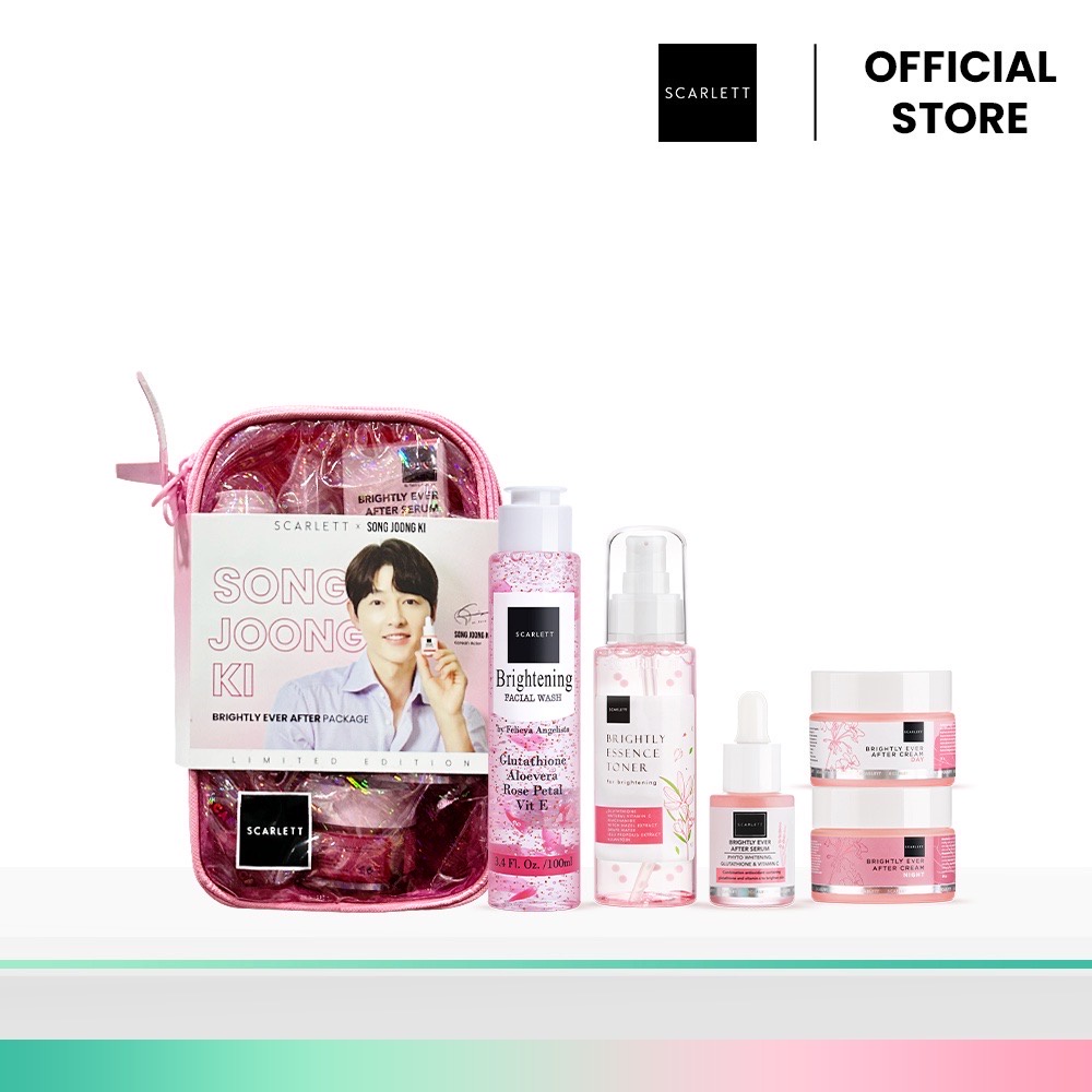 1. SCARLETT Brightening Facial Wash 100ml 2. SCARLETT Brightly Essence Toner 100ml 3. SCARLETT Brightly Ever After Serum 15ml 4. SCARLETT Brightly Ever After Day Cream 20gr 5. SCARLETT Brightly Ever After Night Cream 20gr