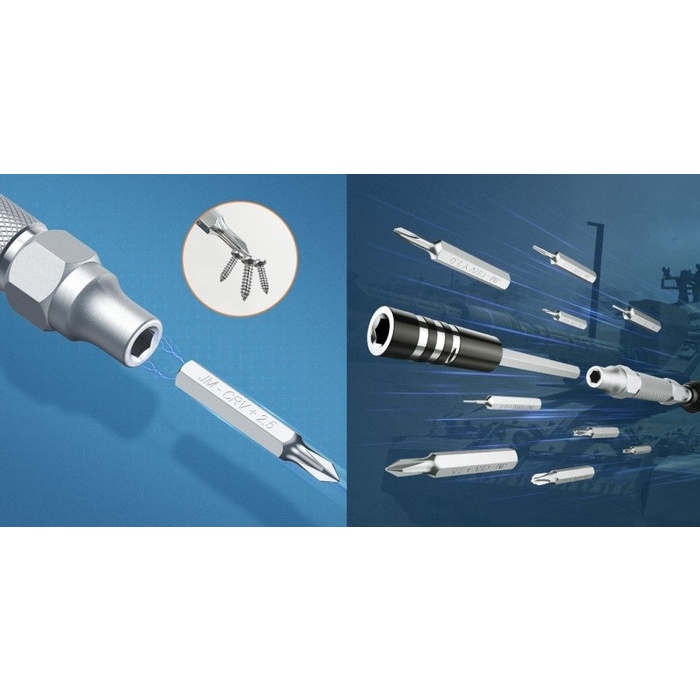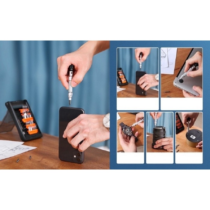 *Aluminum alloy handle, magnetic extension bar, 36 screw bits *Ergonomic handle, rotating cap design, easy and flexible for operations *The front end of the handle with magnetical design can hold the bits and magnetize the screws *Chrome vanadium steel forging and heat treatment, the screw bits are durable *Fully automatic flip cover, you can open and stand this until on your desk by pressing the button on the box *Meet most repairs needs, such as phone, computer, switch, camera, radio or Drone