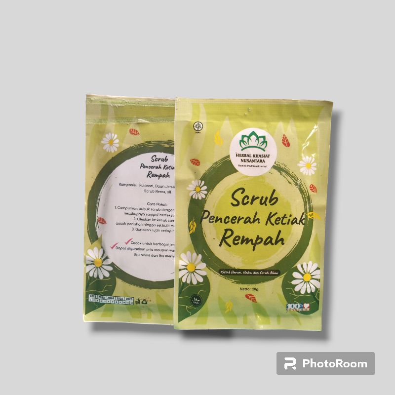 1. Campurkan bubuk scrub dengan air/ air mawar secukupnya sampai bertekstur pasta. 2. Oleskan ke ketiak sambil digosok perlahan hingga sel kulit mati terangkat 3. Gunakan rutin setiap hari